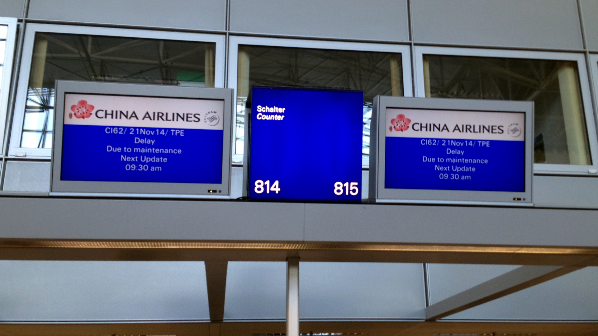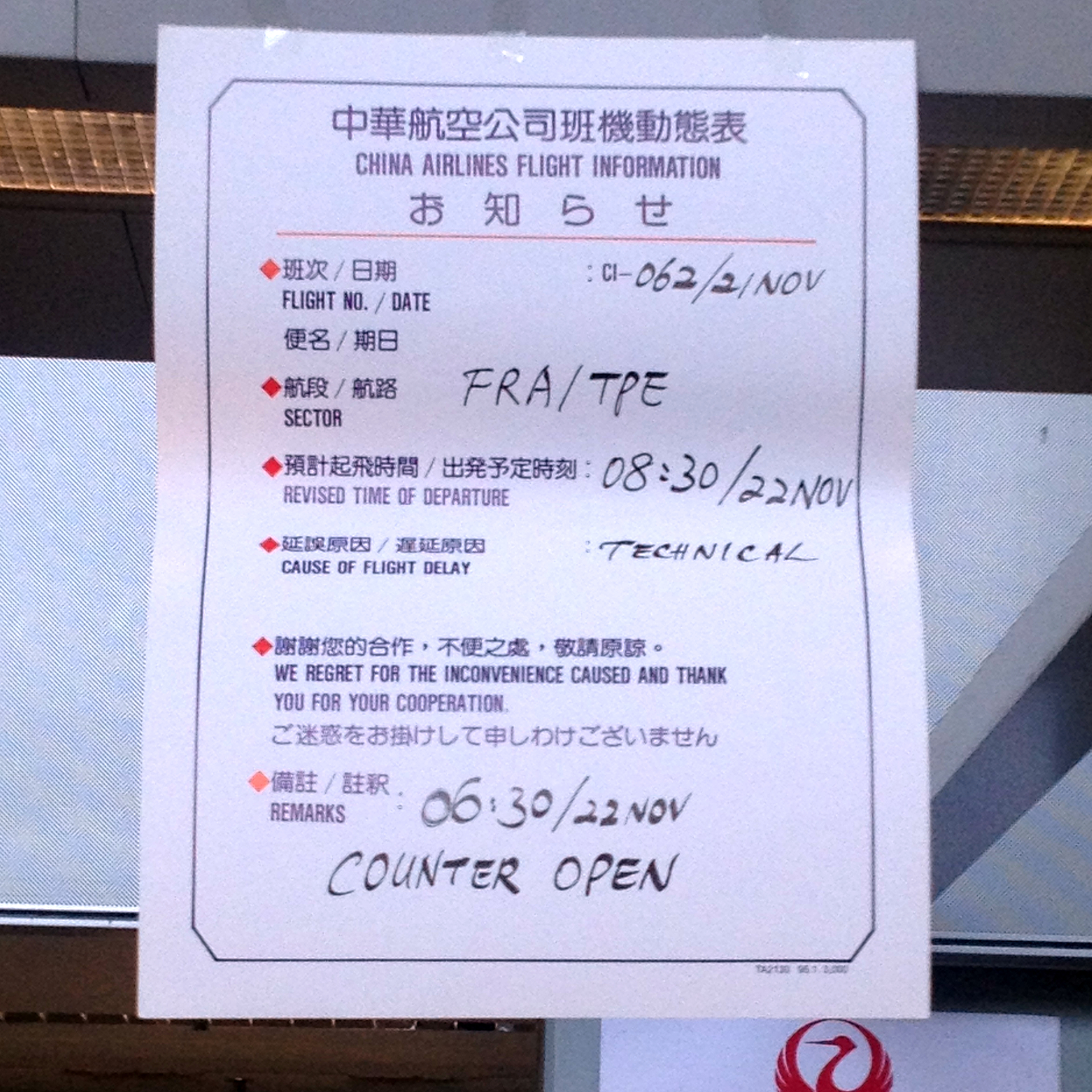 Abreise von Frankfurt nach Teipeh aufgrund eines kaputten Flugzeuges gecancelt.